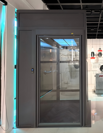 Includes a bottom safety sensor that detects any obstacle beneath the cabin, automatically halting movement to protect pets, children, and users. Additional safety features include an emergency stop button, manual lowering system, and automatic door interlocks.